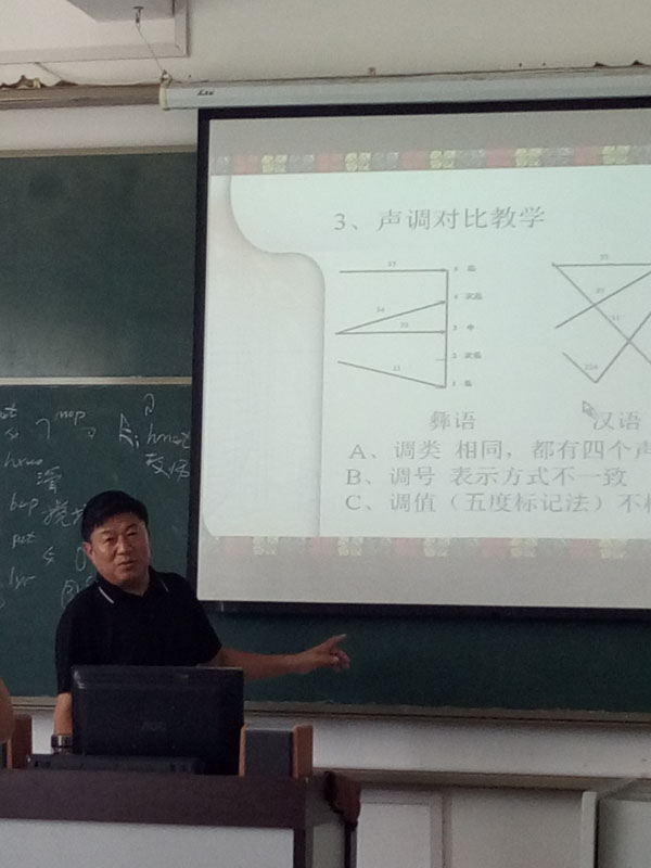 西昌学院彝族文化研究中心主任沙马打各教授受邀,于2019年6月7-8日远赴楚雄师范学院承担了通用彝文《彝语语音》和《彝语语法》两门课程的教学;沙马打各教授认为,这批骨干教师是楚雄州推广通用彝文的核心人才队伍,是楚雄州通用彝文走向规范和普及的先遣队,不仅课前做好了精心准备,在上课的过程中,沙马老师结合现代传媒技术,手把手教会学员们怎么安装手机彝文字体、电脑彝文软件;向学员们推送了网络学习彝文的“彝语在线”等平台和“唯彝出版”等微信公众号。