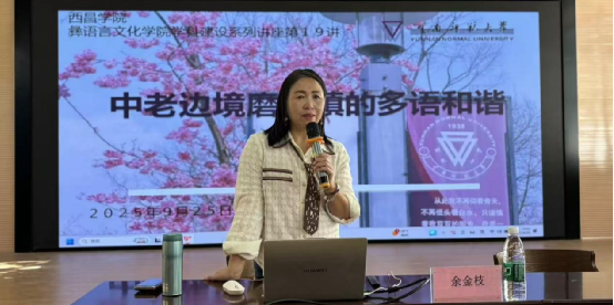2025年9月25日下午,西昌学院彝语言文化学院学科建设系列讲座第19讲在西昌学院邛海校区学生活动中心二楼举行,云南师范大学二级教授、博士生导师、国家社科基金重大项目“中国苗语方言地图集”首席专家、2024年度《国家哲学社会科学成果文库》入选者、云南省云岭学者、省委联系专家、省政府特殊津贴专家、云南省哲学社会科学创新团队学术带头人、中国民族语言学会常务理事、云南语言学会会长、《民族语文》编委、云南省社会科学联合会学术委员会委员余金枝教授为我院师生带来题为“中老边境磨憨镇的多语和谐”的精彩专题讲座,讲座由彝语言文化学院阿牛木支教授主持,学院师生积极参与。