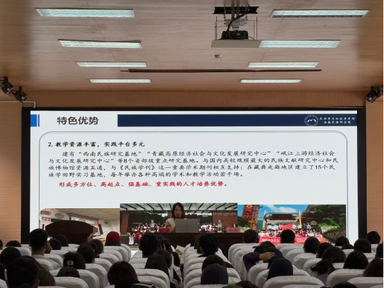 侯玲对西南民族大学民族学与社会学学院的办学历史、学科特色、教师队伍、实践平台、人才培养、研究方向等进行了介绍,对硕士研究生的培养模式作了细致解读,向同学们详细讲解了学院各招生专业、科研成果、就业方向等基本情况,鼓励同学们努力读书,走出大山,实现人生价值。