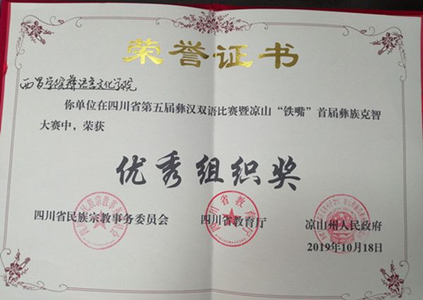 在彝族克智大赛决赛中,我院学生吉柳日者以优异的表现荣获唯一的一等奖。此外,我院学生石一石者也获得了克智组三等奖;我院荣获优秀组织奖。