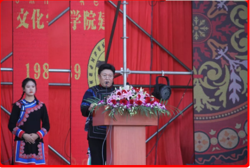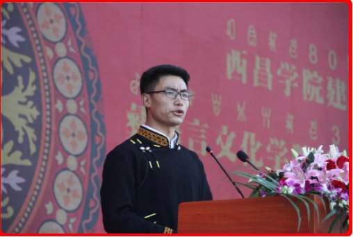 学生代表吉柳日者发言,他用彝族语言谈到,自己能成为彝语言文化学院学子的开心与骄傲,真挚表达了对学院培养的感谢,他为学院三十年取得的发展成就感到无比自豪,他代表全院学生庄严承诺:我们定会努力学习,继承并发扬彝族传统文化,终有一日成为学院的骄傲!最后,他希望彝语言文化学院蒸蒸日上,再谱华丽篇章!