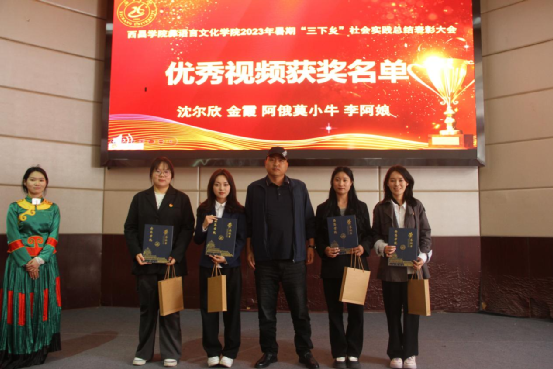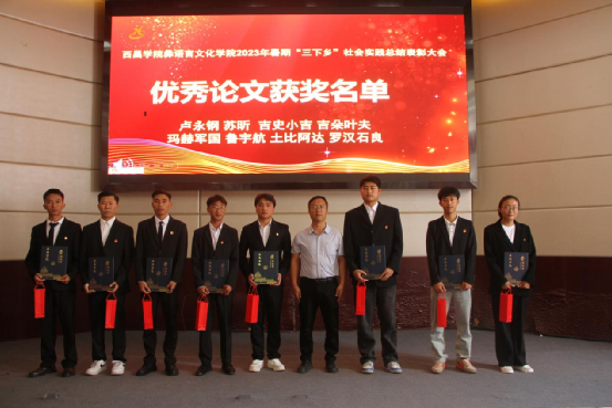 学院分团委书记沙马阿木老师宣读关于 2023年暑期“三下乡”的社会实践表彰名单,对2023年彝语言文化学院暑期“三下乡”社会实践活动总结。阿木老师指出:希望获奖的同学珍惜荣誉,再接再厉,在今后的社会实践中再创佳绩,以先进为榜样,到基层和人民群众中去建功立业,在社会实践的大舞台中书写别样的精彩人生,去做有为的新时代好青年。同时指出希望同学们努力增强才干,锻炼毅力,培养品格的良好机遇,争做有理想、敢担当、能吃苦、肯奋斗的新时代好青年。