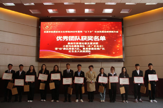 随后,学院领导和老师分别为获得奖项的团队和个人颁发了获奖证书和奖品。本次实践活动成效显著,亮点纷呈,参与同学们勇于担当、奋发有为,真正做到了主动到实践中去,到人民群众中去,到基层一线去。在乡村振兴、国情观察、农村调研等领域中勇担时代重任,展现出青年大学生书写奋斗青春的担当作为,通过社会实践为舞台,在厚植家国情怀、了解国情民情、增长知识才干、激发挺膺担当等方面取得了可喜的成绩。