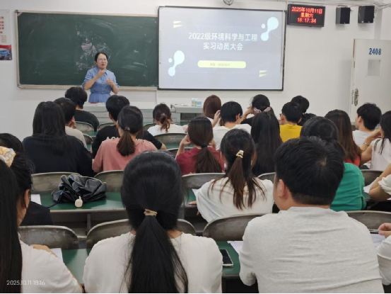 为切实做好2022级本科生毕业实习工作,强化实践教学环节,帮助学生明确实习目标与任务,资源与环境学院于2025年10月13日在致远楼召开了毕业实习动员大会。会议由学院组织,环境科学与工程和土地资源管理两个专业的全体学生参加,王雪梅副院长出席并作动员讲话。