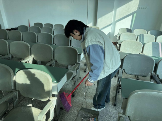 在志愿活动中,同学们携手并进,生动诠释了互帮互助的温暖内涵。有的同学主动包揽下清理死角、搬运重物的辛苦活,默默坚持不松懈;有的同学则耐心分享着清扫技巧与整理经验,与伙伴并肩提高效率、共同完成任务。大家在合作中彼此信任、彼此支撑,不仅高效完成了清洁任务,更在汗水与欢笑中拉近了距离。这既是对劳动价值的尊重,更是对青年学子自觉传承雷锋精神、践行社会责任的充分肯定。