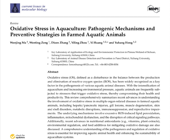 近日,动科学院2023级水产养殖学专业1班本科生马文静以第一作者身份撰写的论文“Oxidative Stress in Aquaculture: Pathogenic Mechanisms and Preventive Strategies in Farmed Aquatic Animals”在国际知名学术期刊《Current Issues in Molecular Biology》(SCIE收录,JCR2区,IF=3.0)在线发表。该论文得到了西昌学院攀登计划(117620023)和西昌市科技项目(18JSYJ13)的支持。论文通讯作者为动物科学学院教师黄毅副教授。