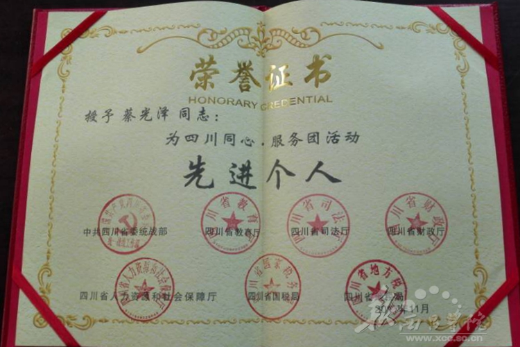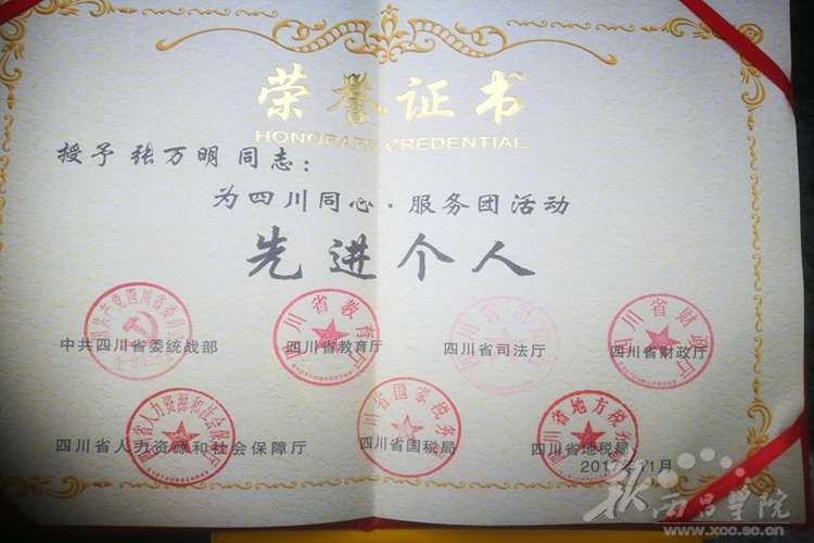 会上省人力资源和社会保障厅副厅长赖荣宣读了《中共四川省委统战部省人力资源和社会保障厅等7部门关于表彰四川同心•服务团活动先进集体和先进个人的决定》。我校同心服务团成员蔡光泽、张万明被评为“四川同心•服务团活动先进个人”。