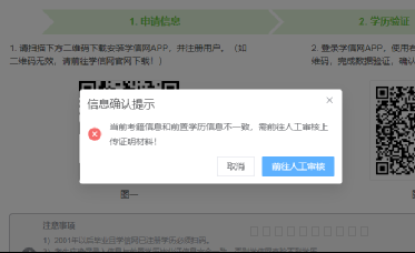 前置学历是2001年以前毕业且学信网已注册学历、全日制军事院校学历、海(境)外学历、以及扫码验证后身份信息不一致的,需要填写信息和上传材料,进行人工审核。