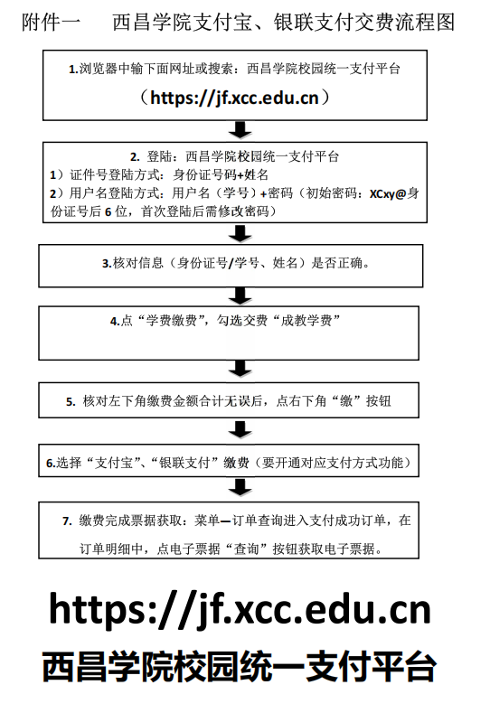 请新入学的成教学生在取得录取通知书之后,拟新注册的自学考试考生在注册之前,自行按照缴费流程将学费缴纳至西昌学院统一支付平台(网址http://jf.xcc.edu.cn.)