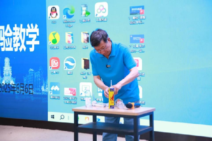 “魔法爷爷”忻元华老师手持自制的科学实验道具登场,瞬间点燃了现场的科学热情。他像一位神奇的魔法师,用简单的材料和巧妙的设计,呈现出利用干冰和水快速制冰的物态变化实验以及通过激光引爆气球的光能转化等妙趣横生的科学小实验,将探究与科学精神洒入学生们心间。