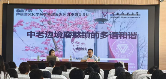 2025年9月25日下午,西昌学院彝语言文化学院学科建设系列讲座第19讲在西昌学院邛海校区学生活动中心二楼举行,云南师范大学二级教授、博士生导师、国家社科基金重大项目“中国苗语方言地图集”首席专家、2024年度《国家哲学社会科学成果文库》入选者、云南省云岭学者、省委联系专家、省政府特殊津贴专家、云南省哲学社会科学创新团队学术带头人、中国民族语言学会常务理事、云南语言学会会长、《民族语文》编委、云南省社会科学联合会学术委员会委员余金枝教授为我院师生带来题为“中老边境磨憨镇的多语和谐”的精彩专题讲座,讲座由彝语言文化学院阿牛木支教授主持,学院师生积极参与。