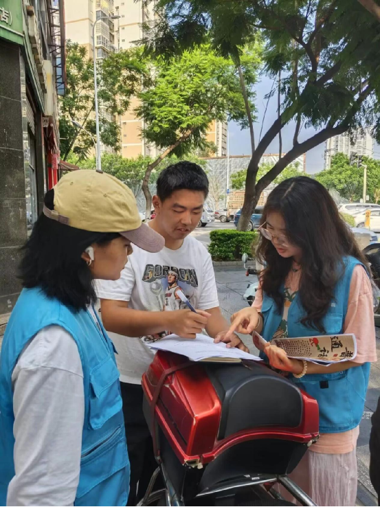 9月14日早上全体志愿者在十二教大厅集合签到并进行相关知识培训。活动正式开始,志愿者们身着统一服装,走街串巷,向行人们发放推广普通话宣传单,耐心讲解使用普通话的好处,同时发放调查问卷了解居民普通话使用情况、学习意愿及推广建议,特别强调了普通话作为通用语言,在促进社会交流、增强文化认同等方面的重要作用。志愿者们还主动与居民进行简短交流,解答疑问,鼓励使用普通话进行日常沟通。