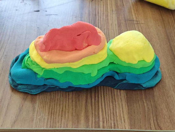 活动以小组协作形式开展,同学们以黏土、橡皮泥为材料,发挥创意与巧思,亲手制作山地、高原、盆地、平原、丘陵等典型地形的三维模型。大家用不同颜色区分地貌类型,以高低起伏塑造地形落差,用层次堆叠还原空间结构,将课本上抽象的等高线与平面地图,转化为可触摸、可观察、可思考的立体模型,在实践中直观理解地貌形态、分布特点与形成规律。